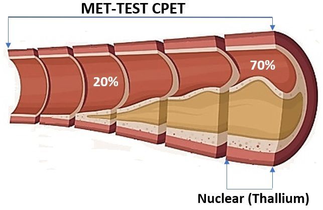 Stress tests can effectively show whether the heart's arteries are 70% blockage narrowed or more. But heart attacks can arise from arteries that are less than 50 percent blocked.